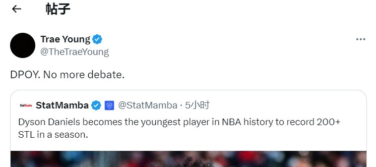 2025-03-24 18:45:39NBA历史上最年轻的单季200+抢断先生!特雷-杨:丹尼尔斯DPOY