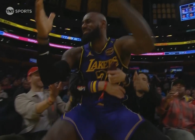 2025-02-26 16:13:56詹姆斯快攻上篮飞出场外摔到场外观众席 裁判未响哨&老詹十分不满