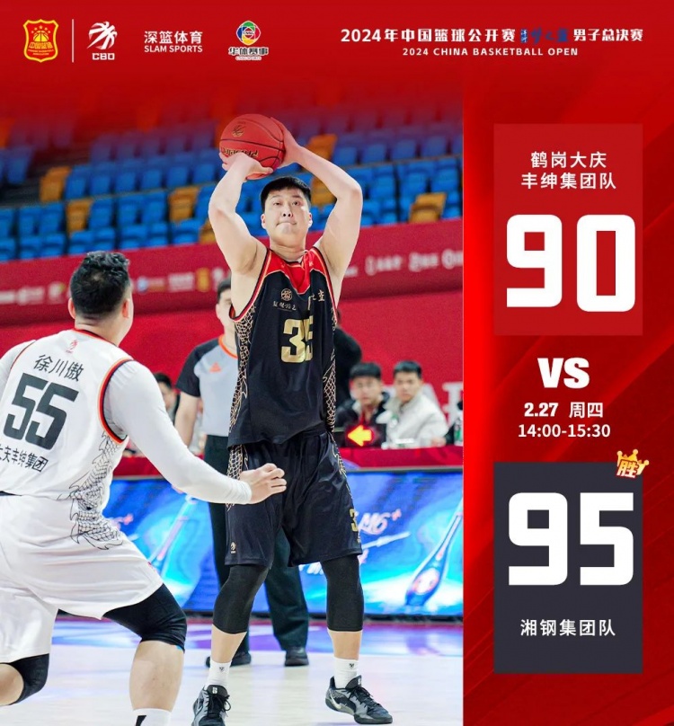 比赛开始,两队上来比较慢热。随后大庆丰绅集团积极拼抢前后场篮板,牢牢把握篮下优势,率先取得领先。湘钢集团组织快攻,同时在外线稳定输出,紧咬比分。半场结束,大庆丰绅集团48-46领先湘钢集团。下半场,两队打得依旧胶着。末节90平后,湘钢集团26号陈双三分命中,2号达斯坦·哈尔恒抢断后上篮得分,帮助湘钢集团95-90战胜大庆丰绅集团。