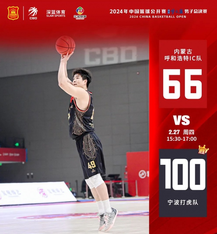 上半场,宁波打虎一开场就展现了超强的得分能力,以16-5领先。内蒙古IC通过外线连续三分,不断追分。但在快攻的情况下,内蒙古IC失误增多,且命中率下降。半场结束,宁波打虎50-26领先内蒙古IC。下半场,两队之间的实力差距愈发明显,宁波打虎最终以100-66战胜内蒙古IC。