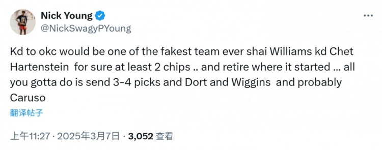 2025-03-07 13:29:58尼克-杨:杜兰特若回雷霆至少能拿两冠 还能在梦开始的地方退役