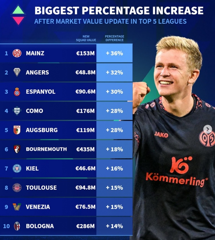 2025-03-28 13:04:28五大联赛球队身价升值比例:美因茨涨36%,博洛尼亚&伯恩茅斯在列